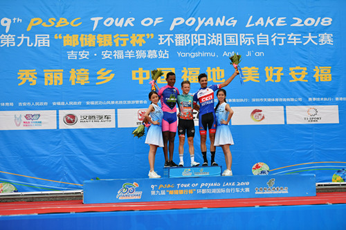 本賽段賽道全程16公里,是本屆環(huán)鄱賽設(shè)置的最短賽程。來自德國助力車隊(duì)的選手阿德內(nèi)?威廉簡僅用35分38秒完成比賽,奪得了本賽段的冠軍。昨日獲得爬坡王(圓點(diǎn)冠軍衫)的厄立特里亞車隊(duì)選手耶馬內(nèi)?謝加伊表現(xiàn)勇猛獲得亞軍并且繼續(xù)保有圓點(diǎn)冠軍衫。塞爾維亞CCN梅達(dá)勒車隊(duì)選手馬爾科?帕夫利察獲得季軍。荷蘭猴城樂園車隊(duì)選手馬爾滕?德容以第八名完成比賽的成績繼續(xù)保有個(gè)人總成績(藍(lán)冠軍衫)。最佳大中華(粉紅冠軍衫)和沖刺王(橙冠軍衫)獲得者均為中國熊貓CCN車隊(duì)選手彭源堂,這也是他連續(xù)三站同時(shí)穿上兩件領(lǐng)騎衫。